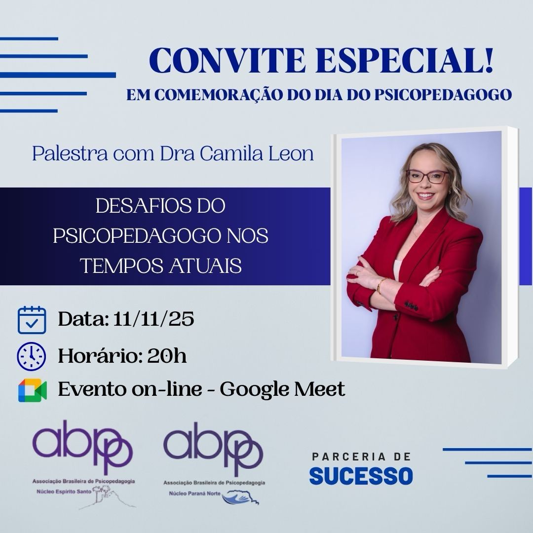 A ABPp Núcleo Espírito Santo e a ABPp Núcleo Paraná Norte, convidam a todos os associados para a palestra de comemoração ao DIA DO PSICOPEDAGOGO!